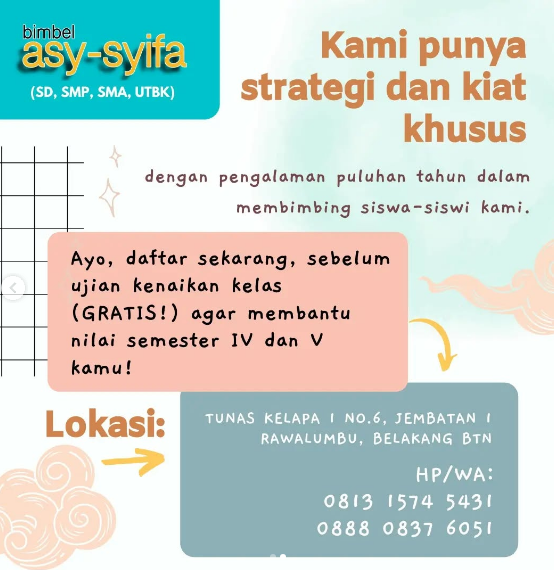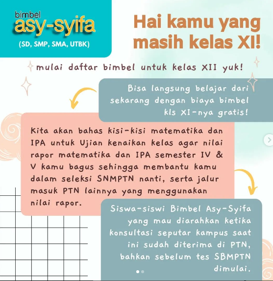 Hai, anak kelas XI! Mau les GRATIS untuk persiapan ujian kenaikan kelas? Yuk ikutan program ini! Kamu bisa mempersiapkan ujian jadi lebih mantap hanya dengan mendaftar bimbel untuk kelas XII nanti. Buruan daftar sekarang, program ini terbatas yaa :)